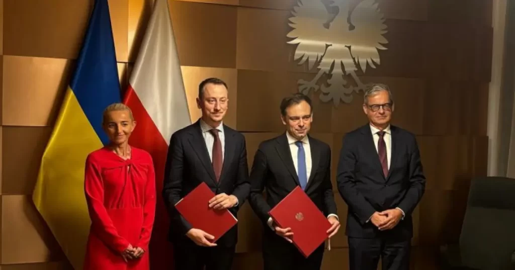 Na zdjęciu, po podpisaniu umowy, od lewej: pierwsza wiceprezes BGK prof. Marta Postuła, minister gospodarki Ukrainy Oleksii Sobolev, minister finansów i gospodarki Andrzej Domański, prezes BGK Mirosław Czekaj.